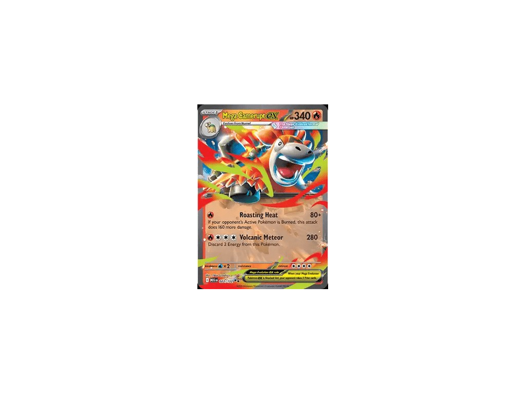 Karta Mega Camerupt ex 022/132 z edice Mega Evolution patří mezi nejsilnější Fire-type karty nové Mega éry. Tento Pokémon disponuje impozantními 340 HP a dvěma ničivými útoky, které z něj dělají hrozbu na herním stole.