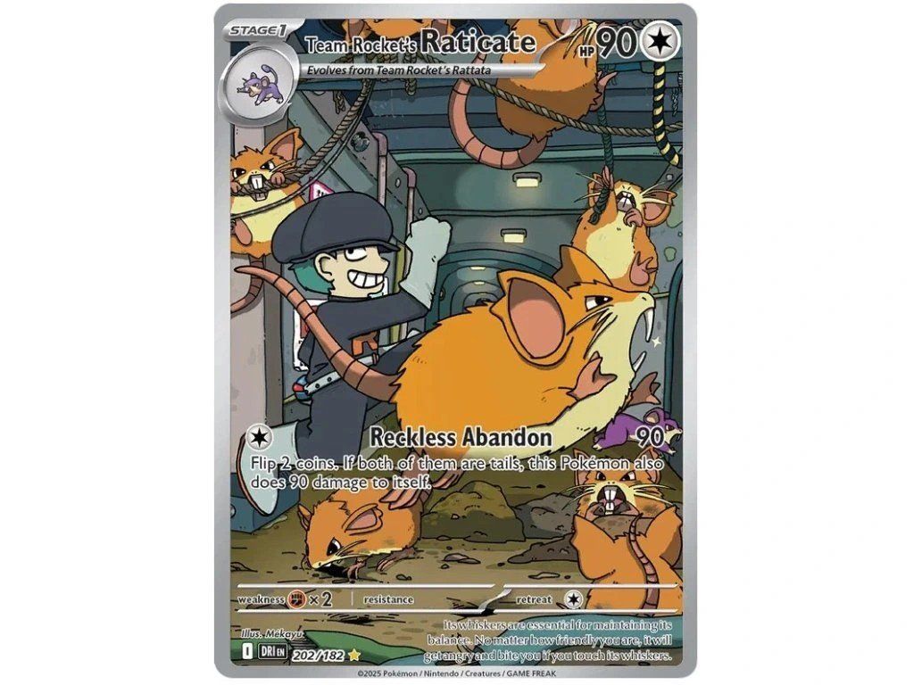 Karta Team Rocket’s Raticate 202/182 z edice Destined Rivals patří mezi atraktivní Illustration Rare karty, které vynikají jedinečnou ilustrací a tématem Team Rocket. Díky svému stylu a raritě je skvělou volbou pro sběratele, kteří hledají zajímavé a vizuálně výrazné kousky.